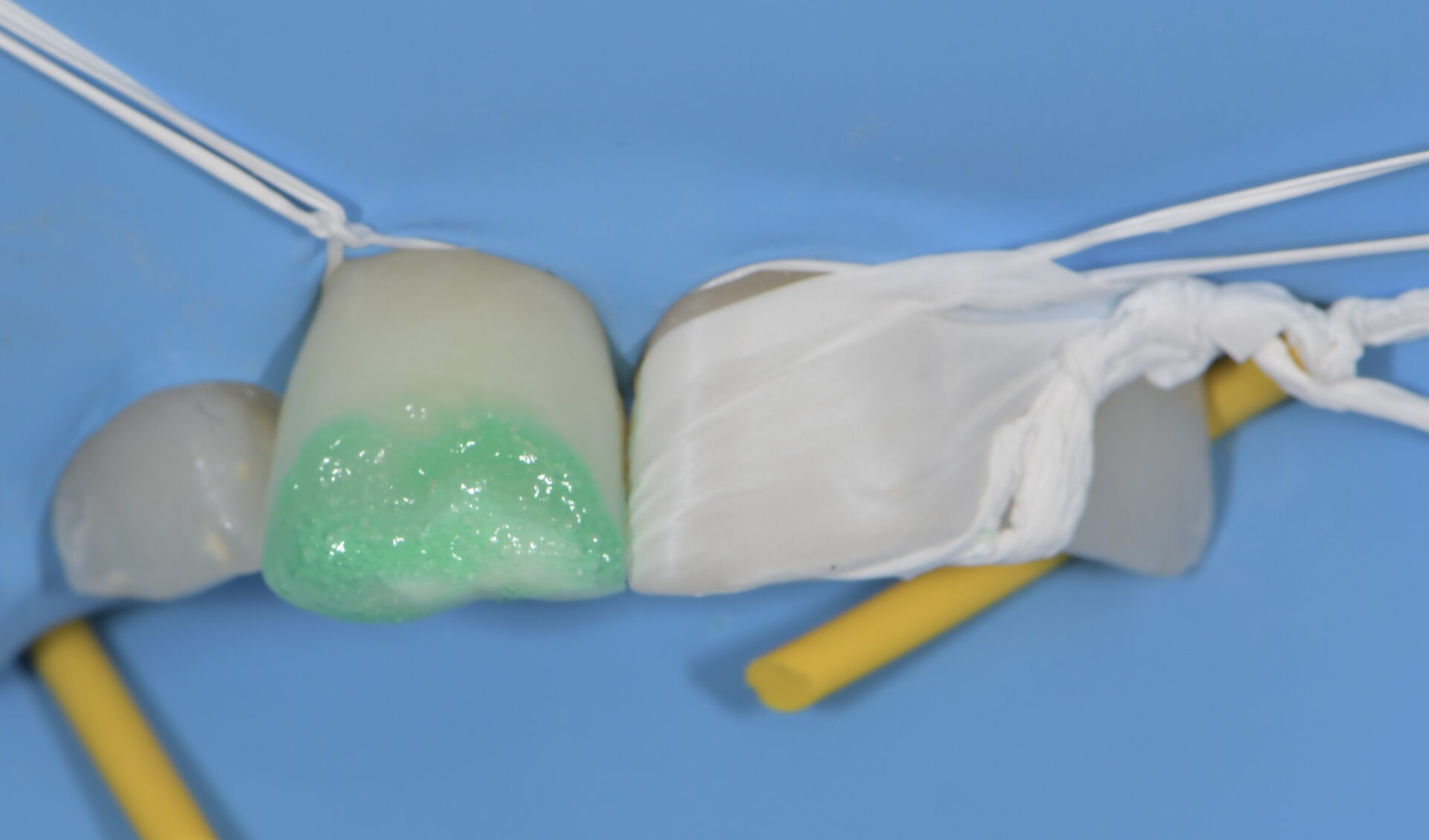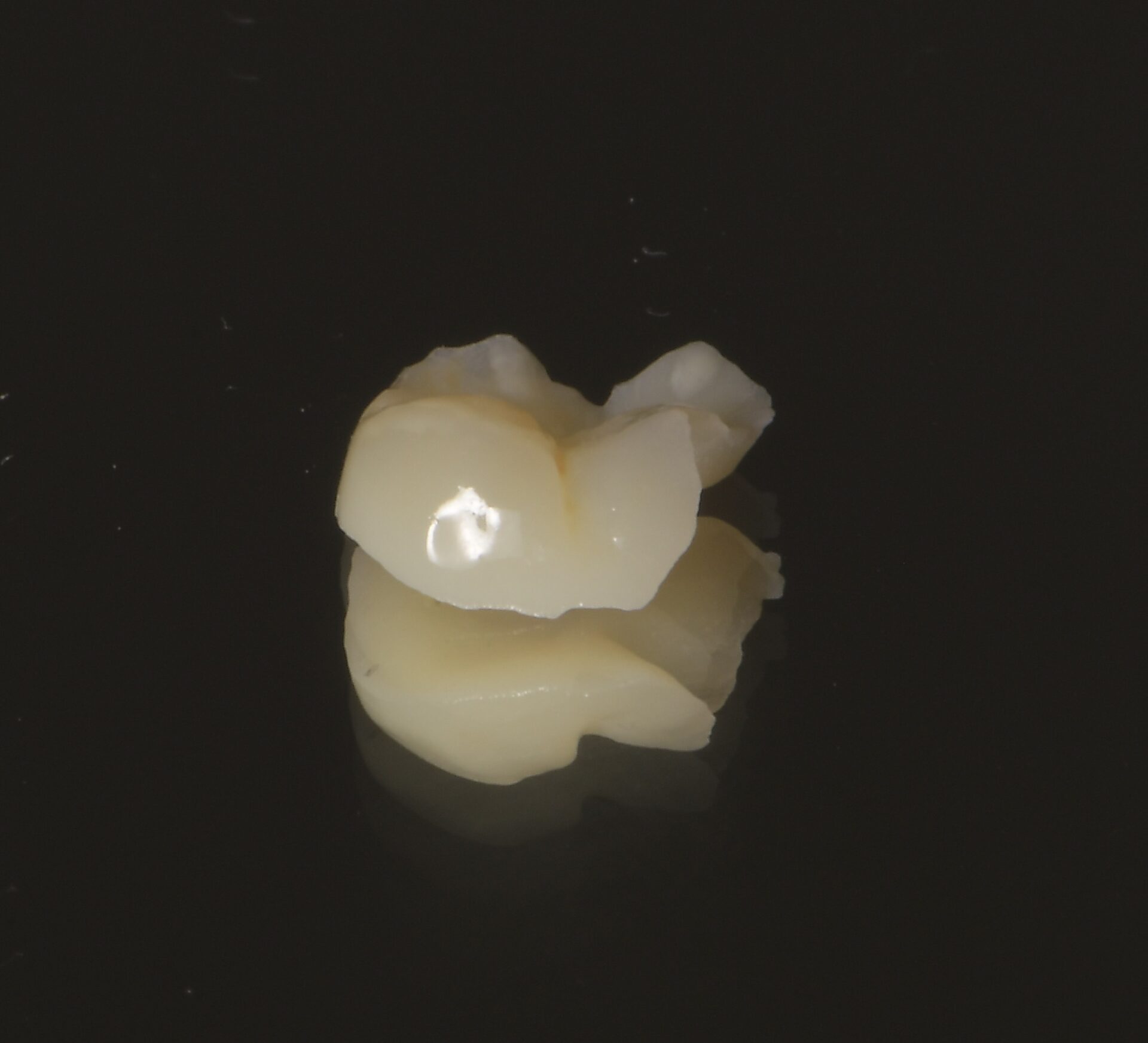 Même si en pédodontie, pour les restaurations indirectes, le composite est assez plébiscité, le fait de réaliser ces onlays directement en céramique, permet non seulement, de ne pas réintervenir à l’âge adulte, mais également de ne pas avoir d’égression passive ou de perte de DV à cause de l’usure prématurée du composite. De plus, si des thérapeutiques d’orthodontie doivent être mises en oeuvre pendant la coirssance, le collage sur de la céramique n’est plus un problème. On notera toutefois qu’une dent atteinte de MIH, n’a pas les même propriétés chimiques qu’une dent saine. Si la composition en elle même reste inchangée, il existe une diminution du contenu minéral (prismes d’émail plus aplatis) et une augmentation du contenu protéique (7). Si des protocoles de collage doivent s’effectuer sur de l’émail non sain, déportéiniser à l’aide