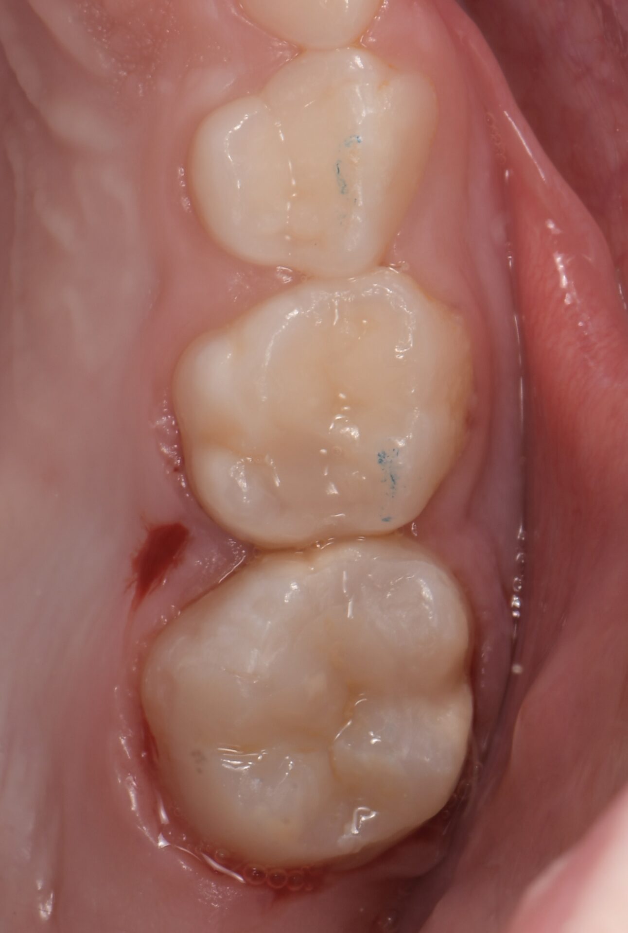 Figure 7 : Scellement de sillon au CVI (triage rose) ayant permis d’attendre l’éruption complète