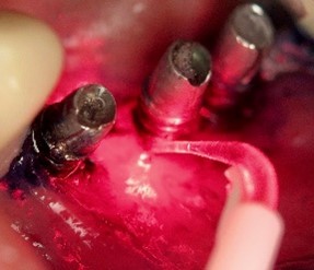 Figure 9: Fibre du laser Helbo 660nm en action, 1 minute par un implant sur 6 sites