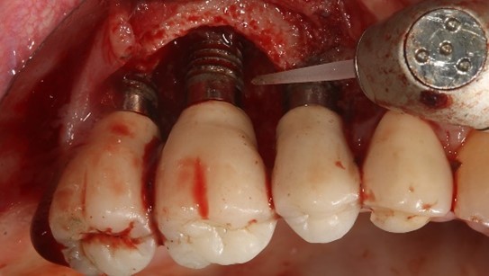 Figure 7: aéro polissage de la surface implantaire à l’aide d’une tête fine (Prophyflex Kavo), après élimination du tissu de granulation