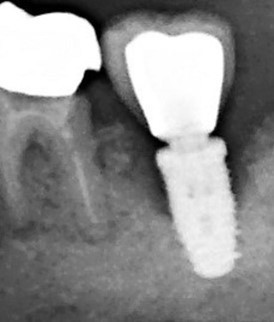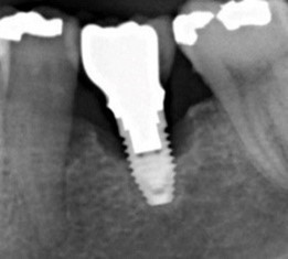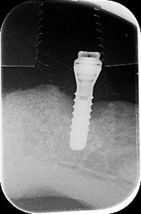 Au stade de « péri-implantite » il s’agit d’une atteinte inflammatoire des tissus mous entourant un implant. Le diagnostic clinique comprend un saignement au sondage, avec une suppuration quasi systématique, et une profondeur de poche péri-implantaire supérieure ou égale à 5 mm. Radiographiquement, un aspect radioclair de déminéralisation osseuse marginale supérieure ou égale à 2 mm entoure une partie plus ou moins étendue du corps de l’implant (fig 1 et 2).