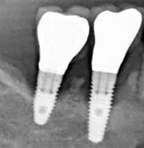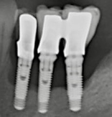 Figure 5 : exemple de périimplantite PA3a (perte osseuse < 50 % de la hauteur des implants adjacents séparés de moins de 3 mm, avec ou sans cratère)