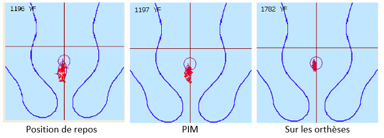 La patiente déclare également se sentir « plus stable » avec ses orthèses. Pour objectiver cela, nous réalisons une analyse de la posture statique. Nous enregistrons sur l’ordinateur la projection du centre de gravité du patient au sol (statokinésigramme).