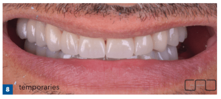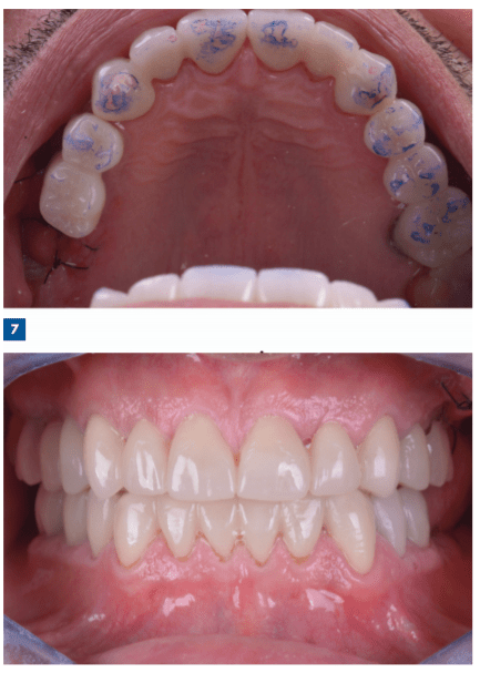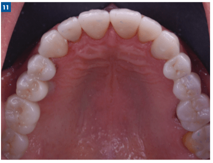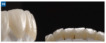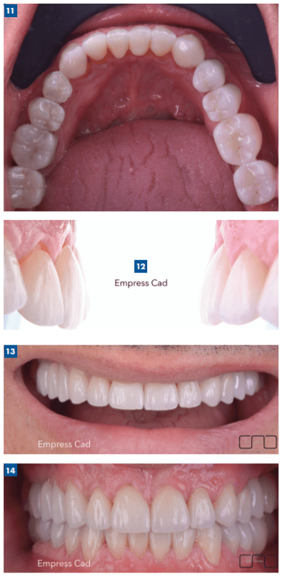 Fig. 10 : le laboratoire de prothèse réalisent des céramiques Empress cad pour les dents antérieures, qui sont usinées et maquillées. Les couronnes sur implants sont transvissées, les prémolaires sont réalisées en Emax pressées maquillées.