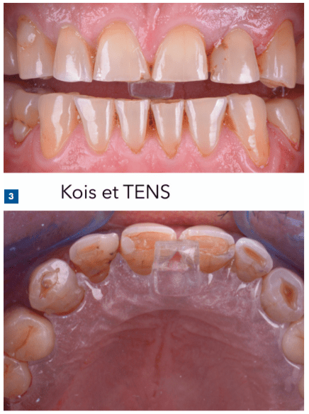 Fig. 3 : nous décidons d’augmenter la dimension verticale pour éviter des préparations trop mutilantes(concept de dentisterie minimalisent invasive). Pour cela nous utilisons une plaque de Kois que nous réglons jusqu’à obtenir l’espace nécessaire pour les réhabilitations antérieures mais aussi postérieures. Pendant cette séance, un electro-stimulateur (TENS) est positionné au niveau des muscles masticateurs afin de déprogrammer le patient mais aussi de relaxer les muscles spasmés.