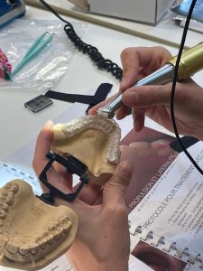 Matériel nécessaire pour les travaux pratiques ou dirigés : blouse, aide optique ou lunette de protection, des modèles (haut et bas) de votre bouche résine ou plâtre, un kois déprogrammé de votre modèle maxillaire, pièce à main + fraise à résine, vos empreintes 3D sur clé USB, contre angle bague rouge